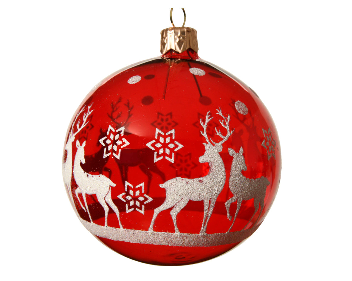 Κόκκινη γυάλινη χριστουγεννιάτικη μπάλα 8 εκατοστών με λευκά ελάφια και λευκές λεπτομέρειες