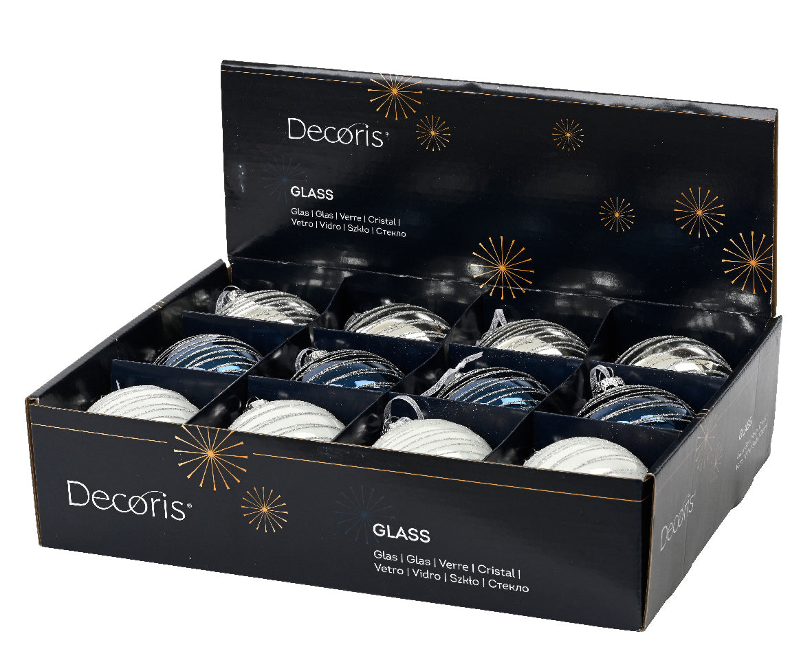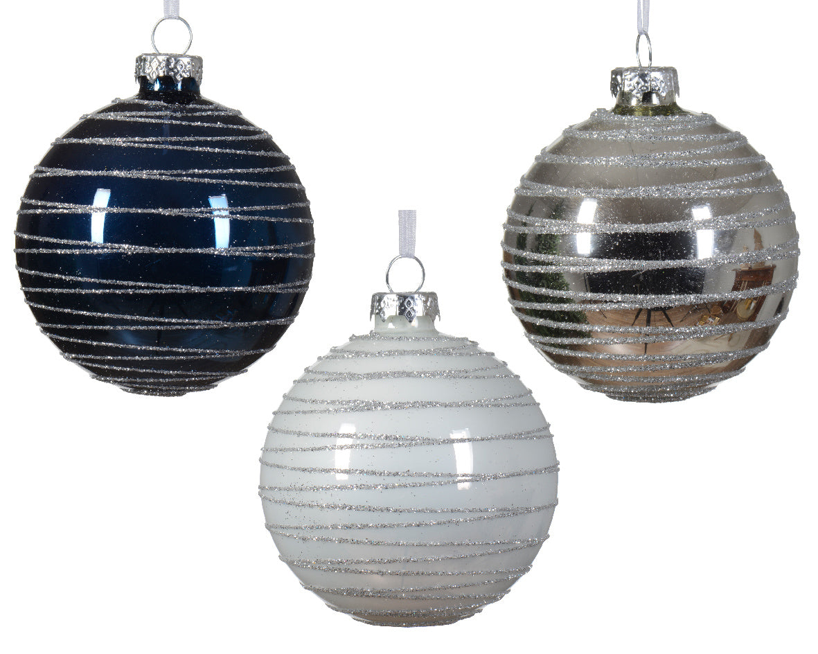 1 γυάλινη λευκή μπάλα 8 εκ. με ασημί glitter λεπτομέρειες