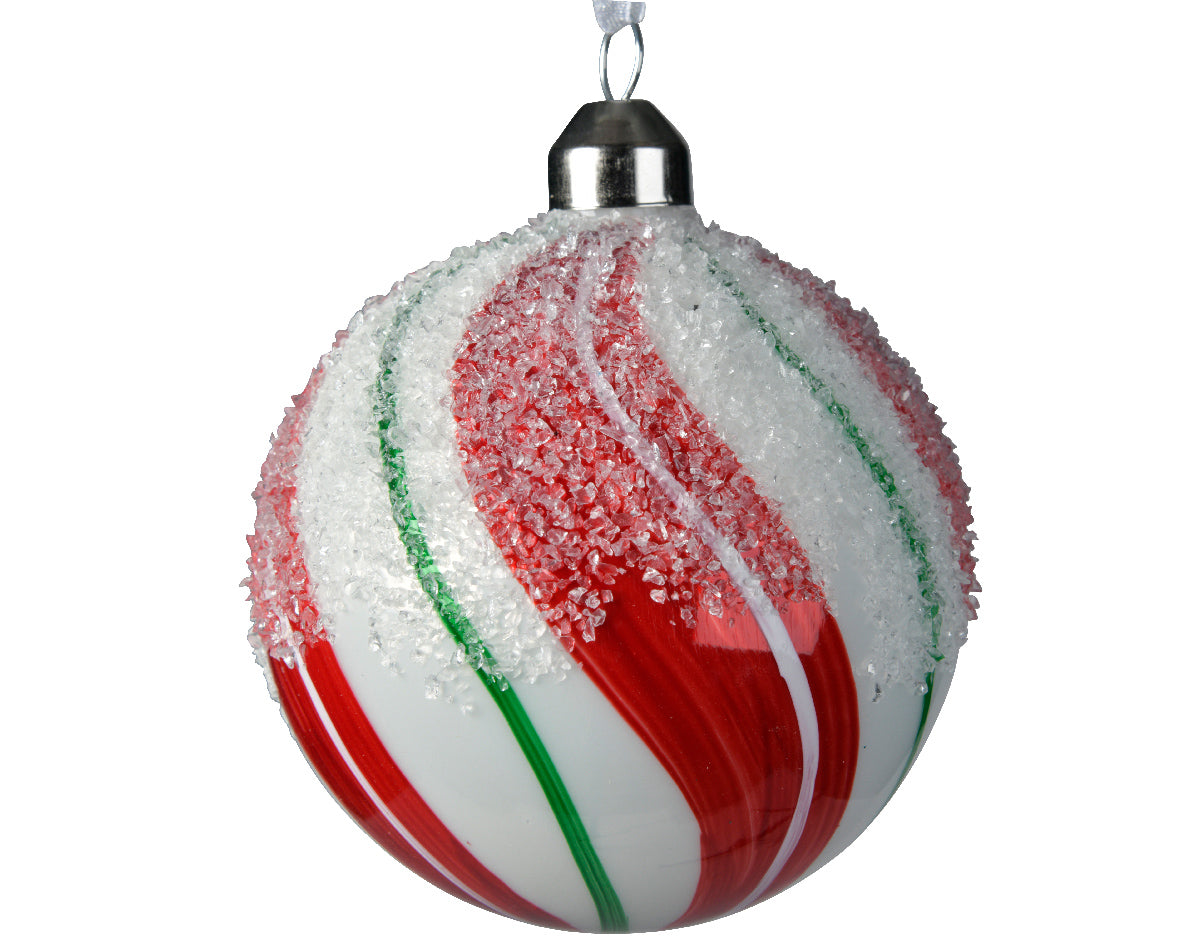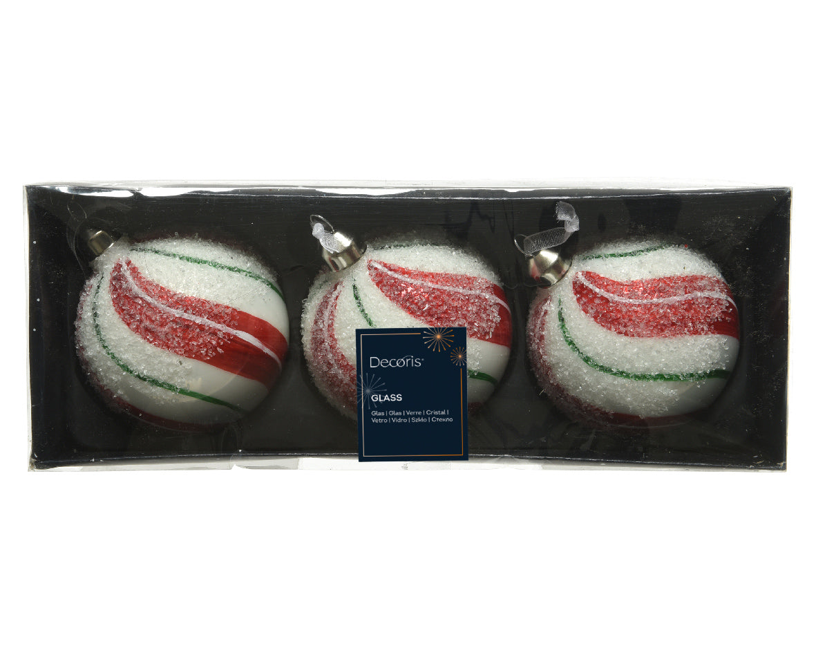 Set που περιλαμβάνει 3 γυάλινες μπάλες 8 εκ λευκού χρώματος, με κόκκινες, πράσινες γραμμές και διακοσμητικό ''χιόνι''.